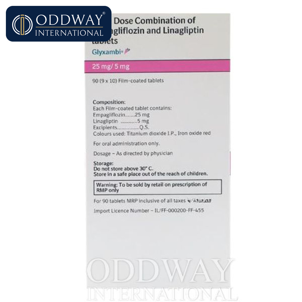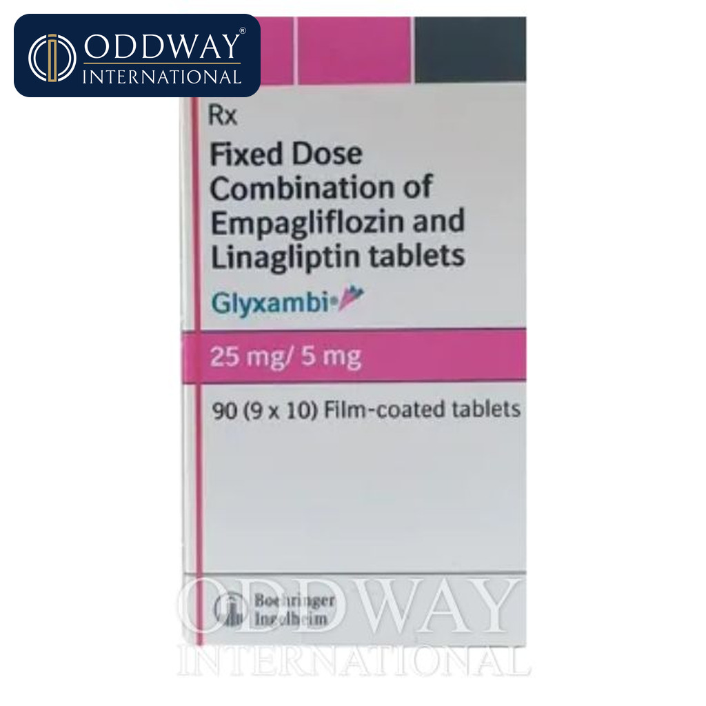 Glyxambi 25/5 or 10/5 Tablet combines two antidiabetic medicines: Empagliflozin and Linagliptin. Empagliflozin removes excess glucose from your body through urine, while Linagliptin lowers glucose production in the liver, delays glucose absorption from the intestines, and increases the body’s sensitivity to insulin.