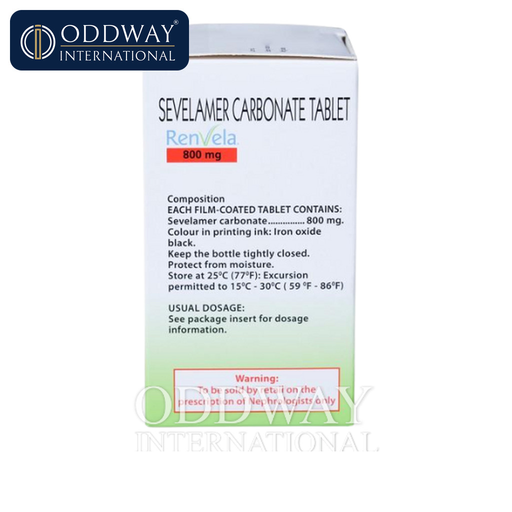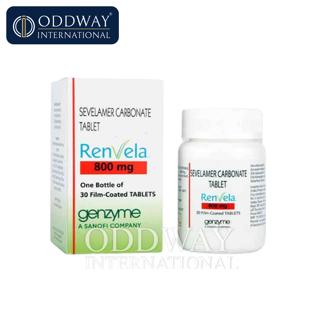 This product is supplied as tablets containing sevelamer carbonate 800 mg. Packaging configurations can vary by brand and market presentation; therefore, Oddway confirms pack size, labeling format, and shipper carton details before dispatch. We support sourcing for branded Renvela or equivalent options where permitted, including generic medicine alternatives when requested and compliant with local regulations.